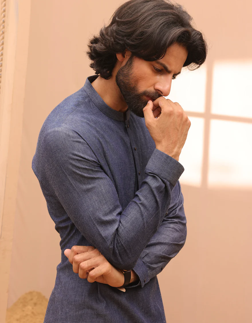 Elevate Your Attire With This Blue Denim Casual Kurta Blending Traditional Aesthetics With Contemporary Style For A Sophisticated Yet Relaxed Look.