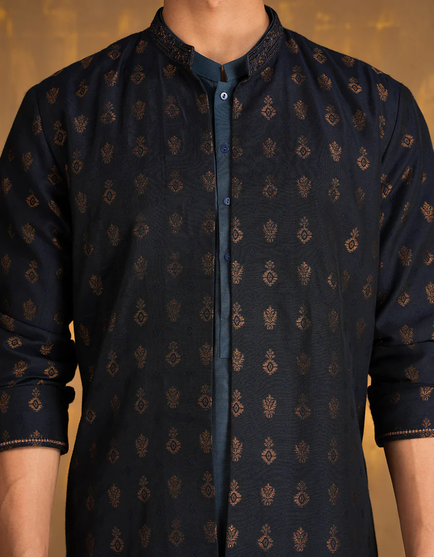 A formal men's blended kurta is the epitome of understated elegance, blending traditional aesthetics with contemporary flair through its refined cuts, luxurious materials, and intricate detailing, making it a distinguished choice for formal gatherings and cultural ceremonies.