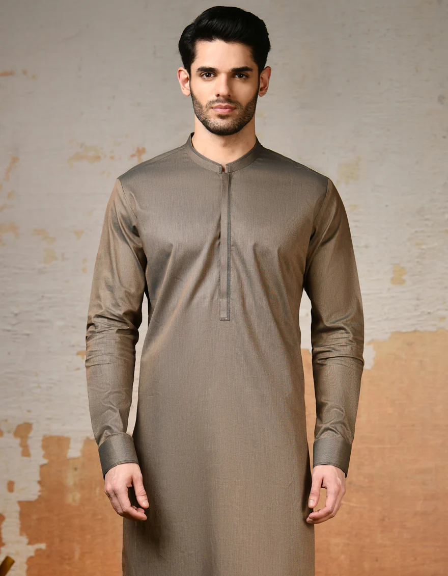 Simple yet stylish this brown cotton casual kameez shalwar offers timeless elegance and versatility perfect for a range of occasions and settings.